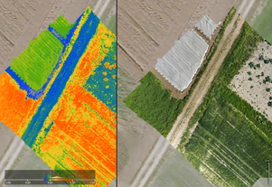 Die Drohne nimmt wiederum ein georeferenziertes Bild der Nutzfläche auf und es wird eine zusammengesetzte Karte erstellt. Die Analyse der einzelnen Lichtspektren zeigt entweder einen Unterschied zwischen gesunden und kranken Pflanzen der Nutzfläche, beziehungsweise über Datenbanken auch um welche Art von Pilz es sich handelt.